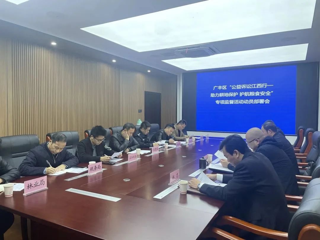 近日,广丰区“公益诉讼江西行——助力耕地保护、护航粮食安全”专项监督活动动员部署会在广丰区人民检察院召开。会议由区检察院副检察长林忠主持,区人大常委会副主任颜显高、区检察院检察长严毅出席会议,区公安局、区林业局、区生态环境局、区农业农村局、区自然资源局等相关单位负责耕地(粮食)保护工作的分管领导参加会议。