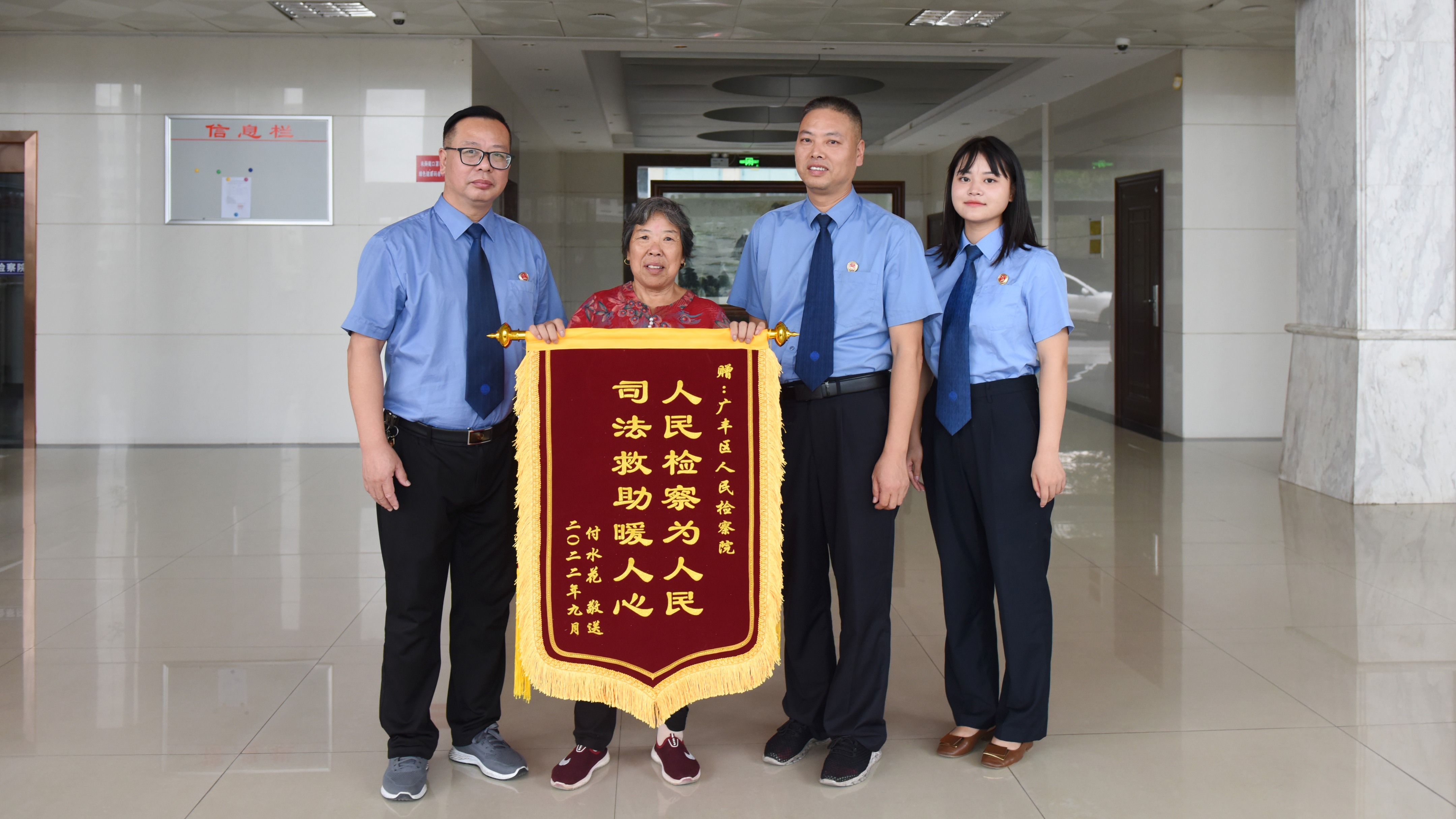 一面锦旗,两行言语,传递着浓浓的感激之情。2022年9月,司法救助当事人付某某来到广丰区人民检察院,将一面印着“司法救助暖人心,人民检察为人民”的锦旗及一封司法救助感谢信交到郑远荣检察官手中,感谢广丰区人民检察院给予发放司法救助金,减轻其家庭经济困难。