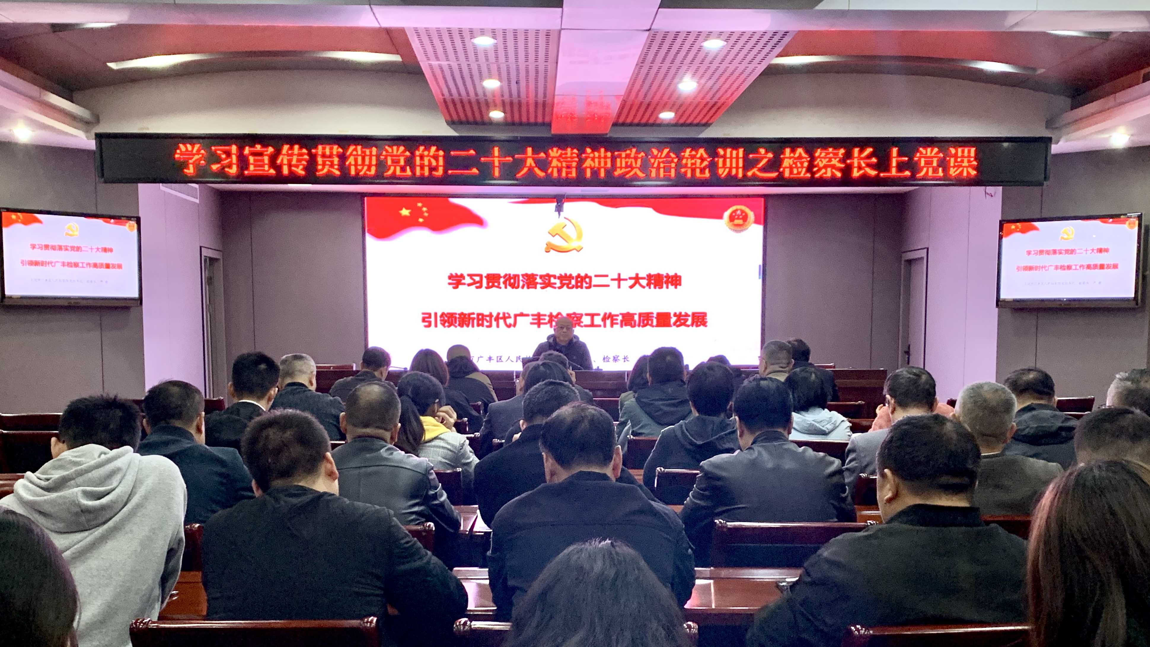 为推动学习宣传贯彻党的二十大精神走深走实,把全体干警的思想统一到党的二十大精神上来,把力量凝聚到党的二十大确定的各项任务上来,近日,广丰区人民检察院党组书记、检察长严毅以“学习贯彻落实党的二十大精神,引领新时代广丰检察工作高质量发展”为主题,为全院干警讲授了一节主题鲜明、内容丰富的专题党课。