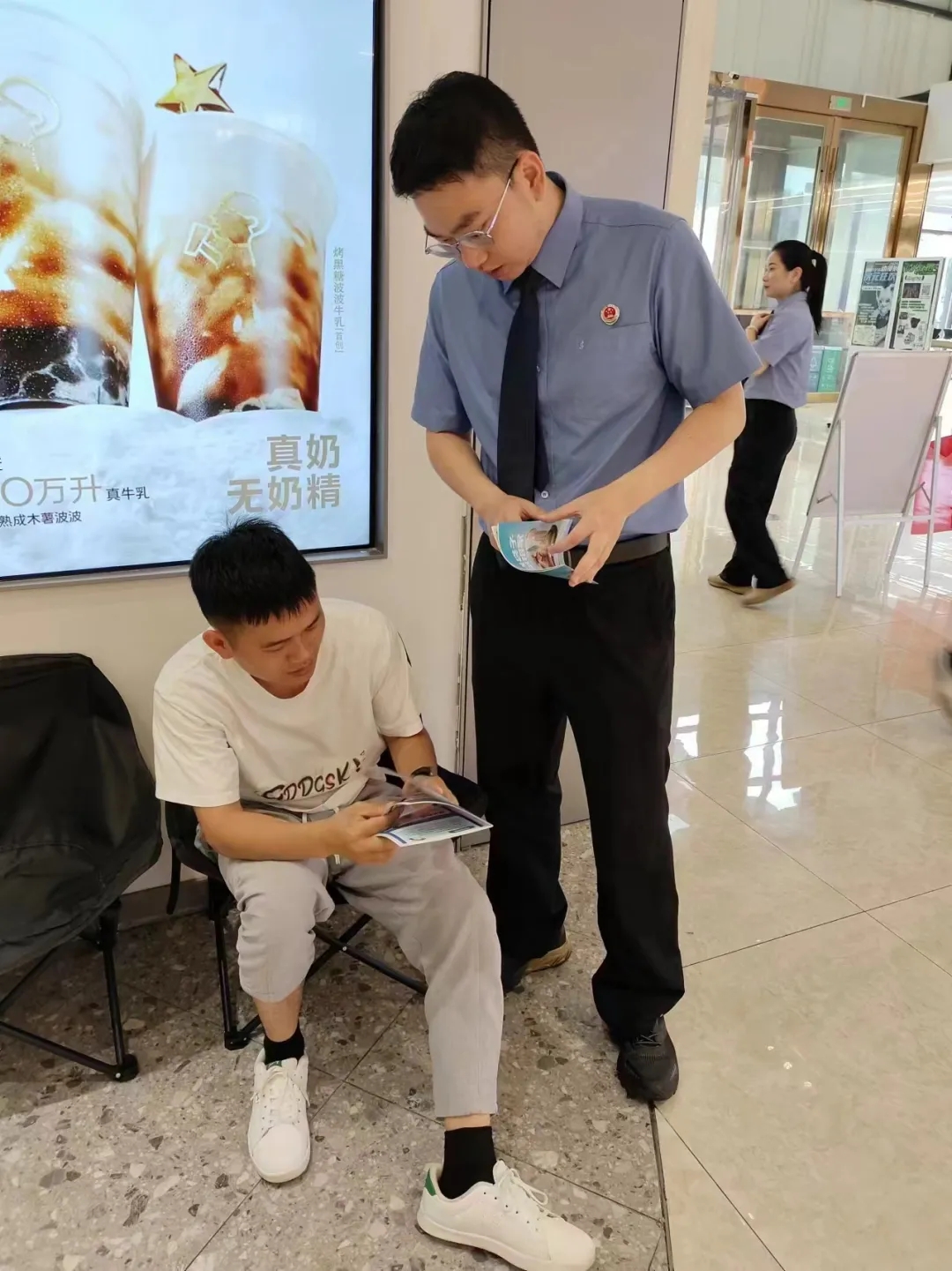 在天虹购物中心,检察干警以《防范和处置非法集资条例》结合典型案例,从非法集资的非法性、利诱性、社会性等特征,到非法集资常见的承诺高额回报、编造虚假项目、以虚假宣传造势、利用亲情诱骗等欺骗手法,向来往群众尤其是非法集资易受害人群之一的老年群众进行普法宣传。